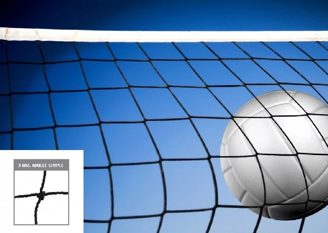 9,5 x 1 m-es UV álló röplabda háló, 2 mm-es szálvastagsággal, 10 cm-es lyukbőséggel, fekete színben. Erős ponyva anyagból 5 cm széles fehér felső szegéllyel, valamint 4 cm-es fekete oldalsó és alsó szegéllyel. A termék 4 mm-es acélhuzalt tartalmaz a feszítéshez.